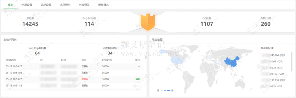 - 新增展示区块:封锁IP列表、攻击地图、攻击IP排行榜、7天拦截趋势图、今日网站拦截TOP5、防御动态等;