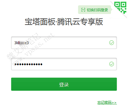 在宝塔面板登录页面输入上面记录的账号、密码,登录宝塔面板成功。