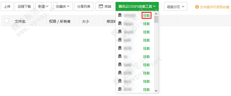 进入宝塔 Linux 面板左侧点击【文件】,在文件管理页面打开“腾讯云COSFS挂载工具”,下拉列表选择对应存储桶后挂载。