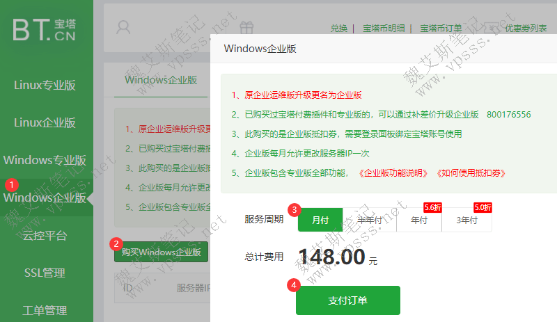 从上图看到宝塔Windows面板企业版提供了多种服务周期,不可使用满减优惠券,没有永久授权版,好在官方有很大的优惠。
