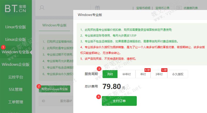 如下图所示是宝塔Windows面板专业版价格列表及优惠。