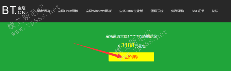 点击打开宝塔面板官网,点击【立即领取】,显示“领取成功”就可以了。