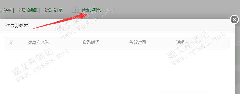 成功领取宝塔面板3188元满减优惠券后,打开宝塔首页,右上角点击“优惠券列表”就能看到提供的优惠券。