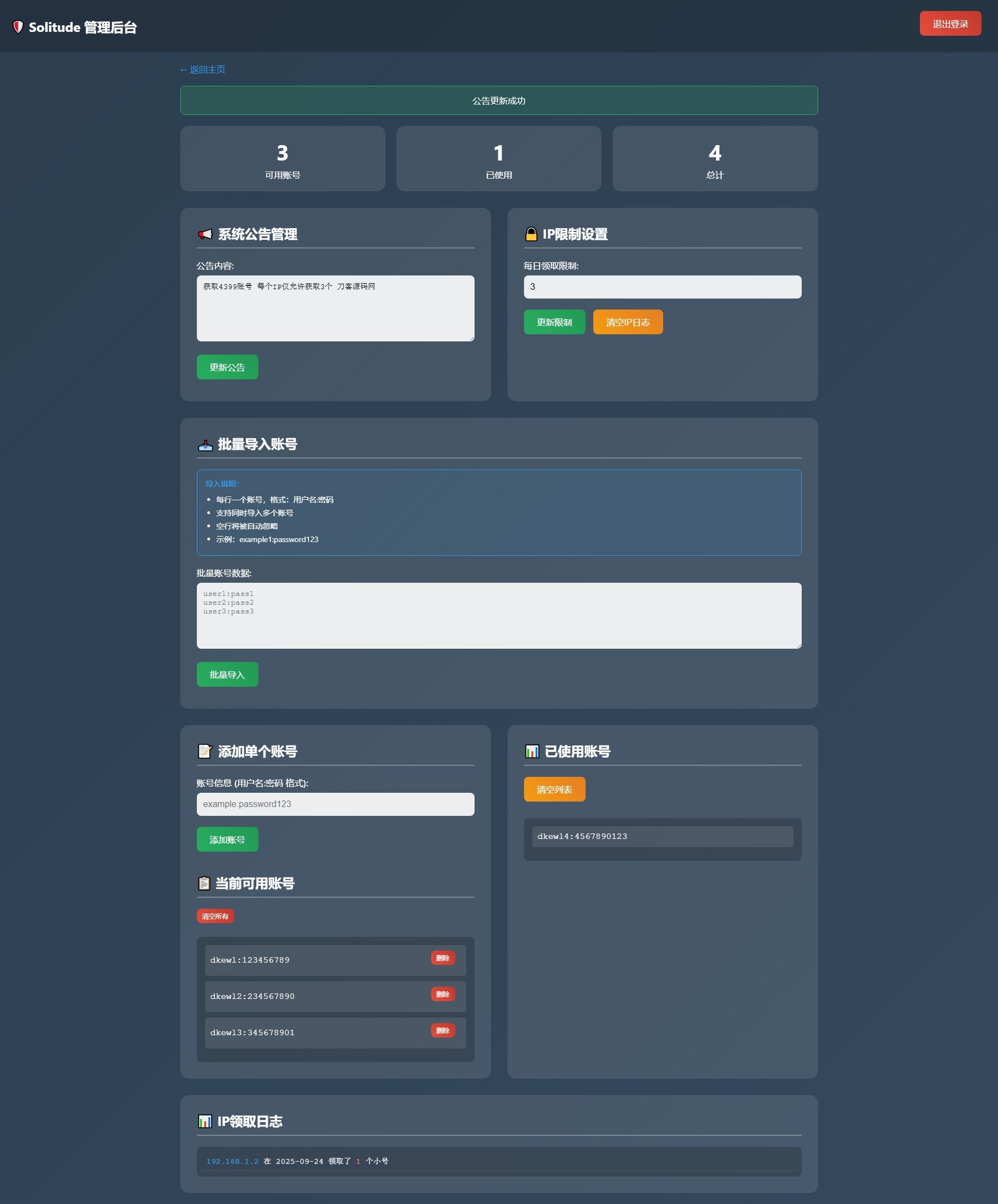 小号分发 卡密分发系统网站源码 轻量化Ferry45天前更新关注私信08246小号分发 卡密分发系统网站源码 轻量化此内容为付费资源,请付费后查看¥1大会员¥0.5超级大会员免费立即购买您当前未登录!建议登陆后购买,可保存购买订单付费资源 简介: 小号分发 卡密分发系统网站源码 轻量化 此为小号分发卡密系统源码,专用于分发小号库存账号或卡密等使用,不过规定每个IP仅能领取3次,也可视作小号分发工具。 已做过简易测试,感兴趣者可自行部署使用! 图片: THE END网站源码 喜欢就支持一下吧点赞46赞赏 分享QQ空间微博QQ好友复制链接收藏