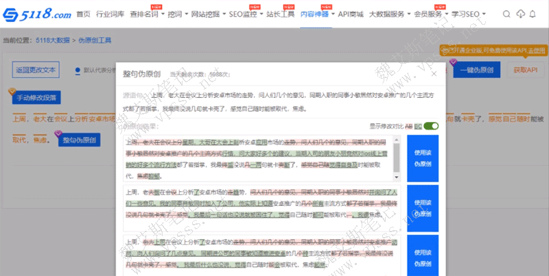 5118免费版会员享受手动智能原创:30次/天,有大量内容待修改请升级到 5118 SVIP会员,享受无限一键智能原创和整句智能原创