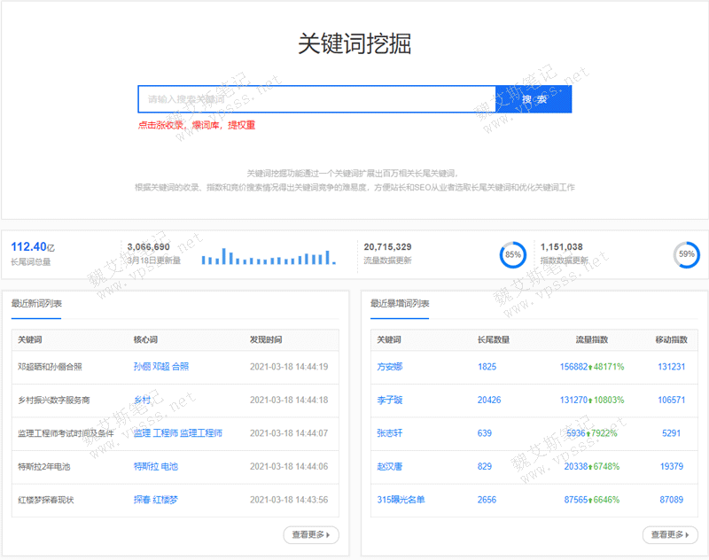 5118关键词挖掘基于5118大数据,关键词挖掘也就是长尾词挖掘,5118把全网的关键词数据通过挖掘、分析、汇总的方式展现到我们面前。今天魏艾斯笔记www.vpsss.net和大家详细说说5118关键词挖掘如何查询长尾词、相关词、全网下拉词及移动端流量词。