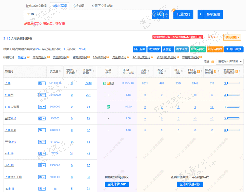 5118普通会员只能查看前五行结果和查看前100页,后面的查询结果和通过导出数据可以查看更多数据,可以通过升级到5118基础版会员和5118 SVIP会员查看更多,使用 vpsss123 优惠码可以获得折扣优惠价格。