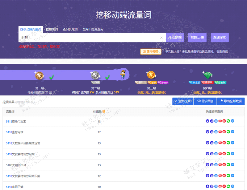 你也可以在此基础上点击【重新挖掘】获取更多大数据结果,点击【导出全部数据】方便在本地进行过滤、分析、汇总。5118免费会员暂支持2次/天的挖掘体验,且不支持导出。升级5118VIP会员可获取5次/天、3层数据,升级5118 SVIP会员可获取10次/天、3层数据。使用 vpsss123 优惠码可以获得优惠折扣价格。