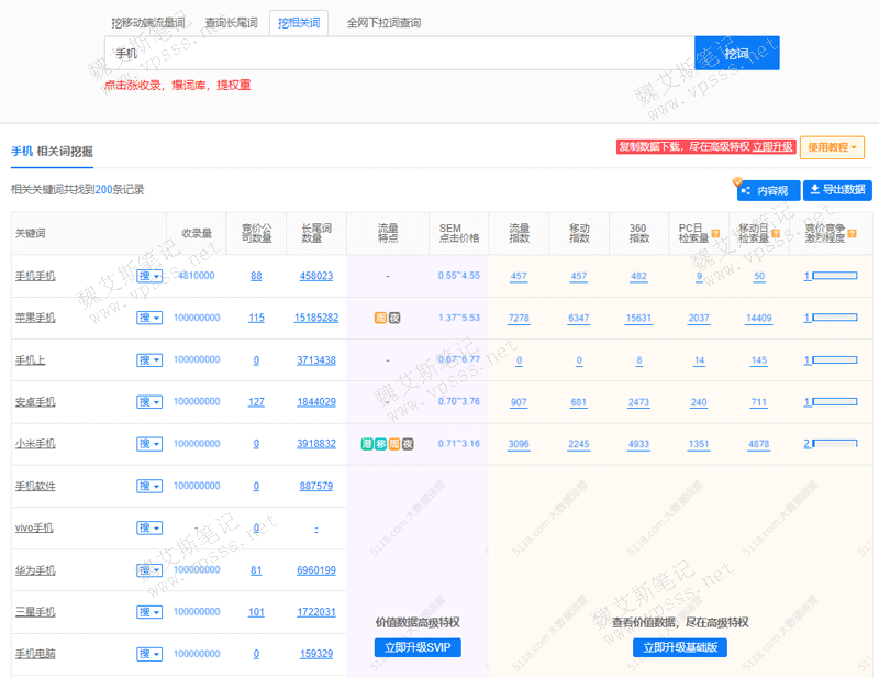 下图是老魏搜索“手机”的5118相关词挖掘。如果你要复制数据下载,需要获取高级特权,立即升级到5118 SVIP会员即可。