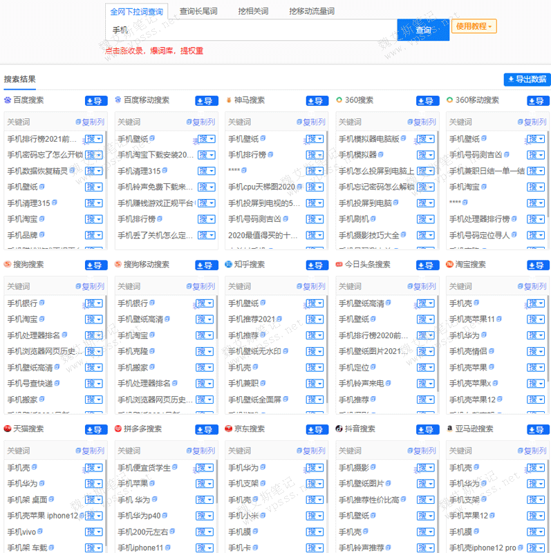 如下图所示可以看到全网搜索引擎的下拉词结果,免去了挨个页面查询、汇总的繁琐、重复劳动。
