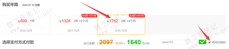 勾选“使用优惠码”,输入优惠码 vpsss123,确定。