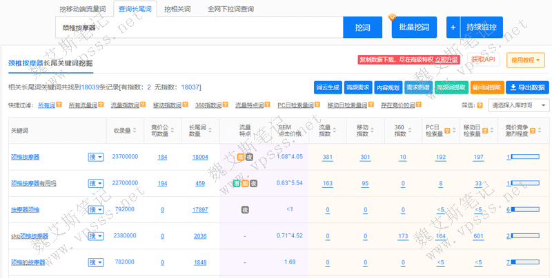 5118免费会员每天只能下载2次数据,每次下载量100条,也就是说每天最多仅能下载200条数据。上面提到的“颈椎按摩器”相关长尾词有18000条,这么下载不但耗不起,商机也早就被别人抢占了。
