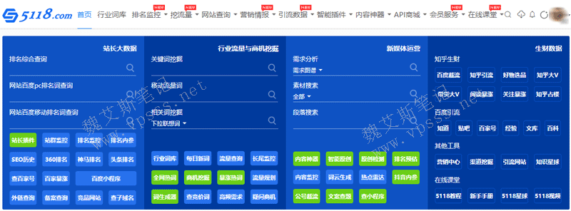 5118提供各种各样的排名大数据。包括关键词挖掘、行业词库、排名监控、挖流量、网站查询、营销情报、引流数据、智能插件、内容神器、API商城等排名必备工具软件,为网站运营者、排名从业人员、新媒体认、数据分析从业人员提供有价值的专业分析结果及导向。如果你想挖掘关键词、监控网站排名、挖掘用户需求词等5118都能快速实现。所以魏艾斯今天就聊聊SEO站长和新媒体从业者必备的工具5118。那么具体来说5118是做什么的网站呢?下面我们简单介绍用5118查询网站SEO大数据和5118挖掘新媒体营销情报的重要功能。