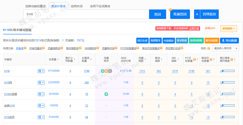 普通用户到处数据有限制,比如5118普通账号每天只有2次导出下载的机会,每次下载数量为100条。如果你查询的是只有几百条的关键词,可能普通账号就够用了。但是如果要查询 5118 这一类热门关键词,就有几千条记录,这时候普通用户的权限就不够用了。