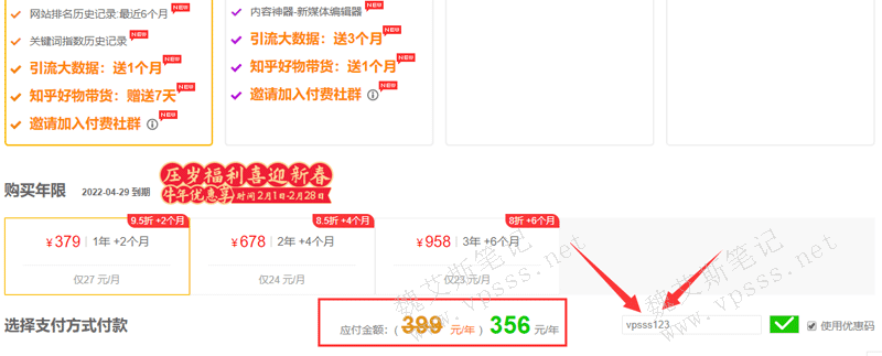 比如5118的VIP账号,如下图所示先选择 VIP,接着勾选“使用优惠码”,输入 vpsss123,就可以获取到优惠价格了(省钱)。