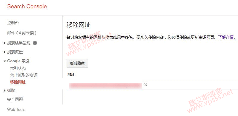 四、谷歌站长工具(search console)中有一个移除网址,里面只有暂时隐藏功能。并且提到要永久移除内容,必须站长自己移除或更新来源网页。其实只要你网页打不开了,或者换新模板了,谷歌很快就可以跟着更新的。