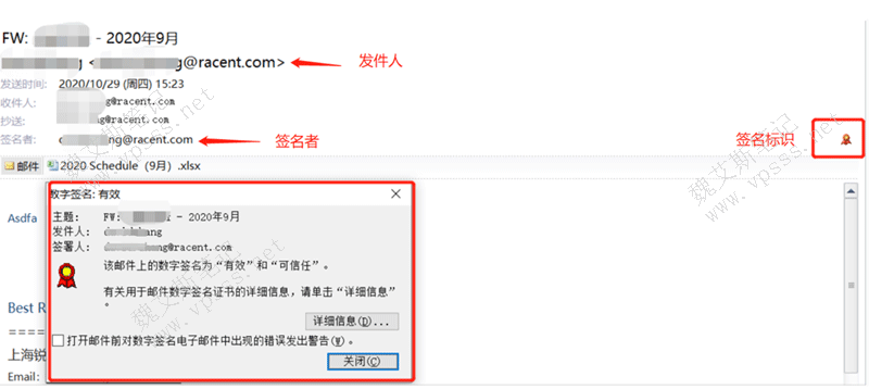 如下图所示用了邮件证书签名后的邮件会显示签发者身份(邮件右上方展示红色丝带图标),点击可以查看证书详情。从数字签名角度帮助收件人识别是否是钓鱼邮件。