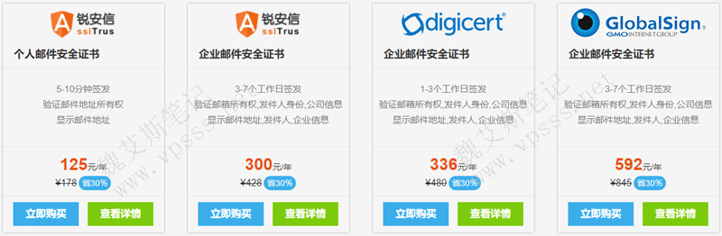 - 性价比高:邮件签名证书价格便宜,只要很少的开销即可实现邮件安全,并可以一次签发多年。