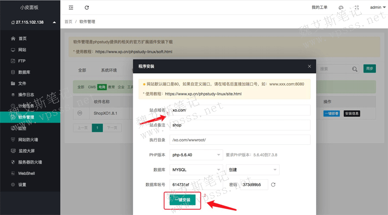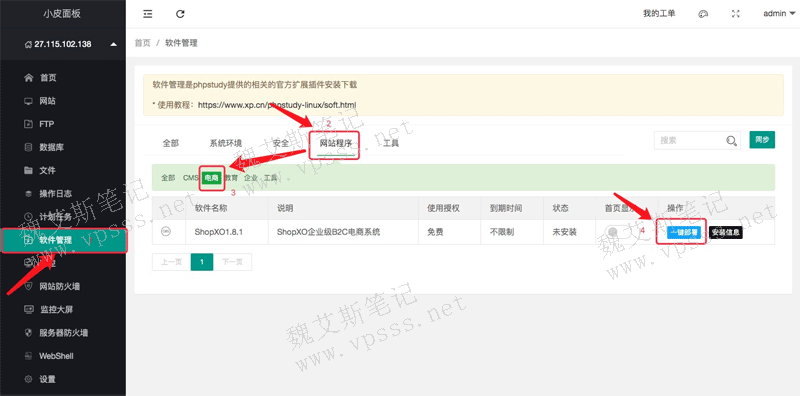 1、登录phpStudy后台>左侧菜单>软件管理 > 网站程序>电商,找到shopxo 或者右侧搜索到之后,再一键部署。