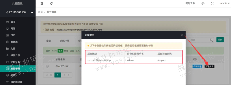 安装完成后,点击安装信息查看站点信息,看到shopxo商城后台地址、管理员账号和管理员密码。