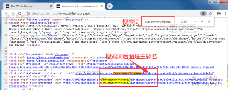 在网页源代码中按键 ctrl+f,搜索 /wp-content/themes/ ;