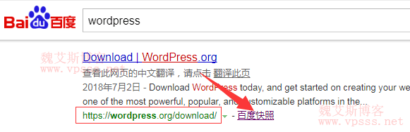 度娘搜索 wordpress,看到如下图的 download 网址后(wordpress org才是正牌官网),点击后面的【百度快照】