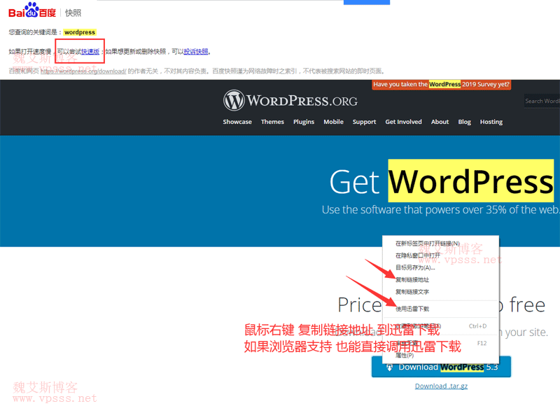 看到百度快照页面后,找到蓝色的 download 大按钮,鼠标右键复制链接地址,打开迅雷下载最新版 wordpress程序。如果你的浏览器支持,也能直接调用迅雷下载。
