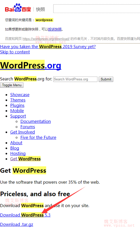 如果打开后是百度快照的快速版,就用 ctrl+f 搜索 【download】,看到下图中的 download for WordPress5.3,同样可以下载。