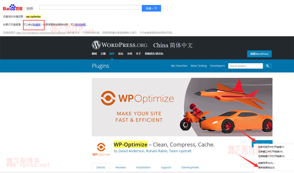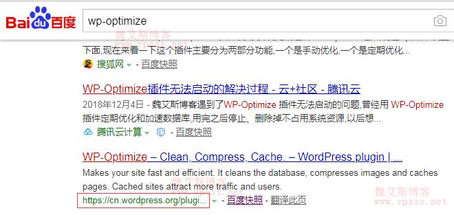 下面是插件在百度快照中的搜索、下载方法,和上面是一样的。老魏以 【wp-optimize插件】举个栗子。