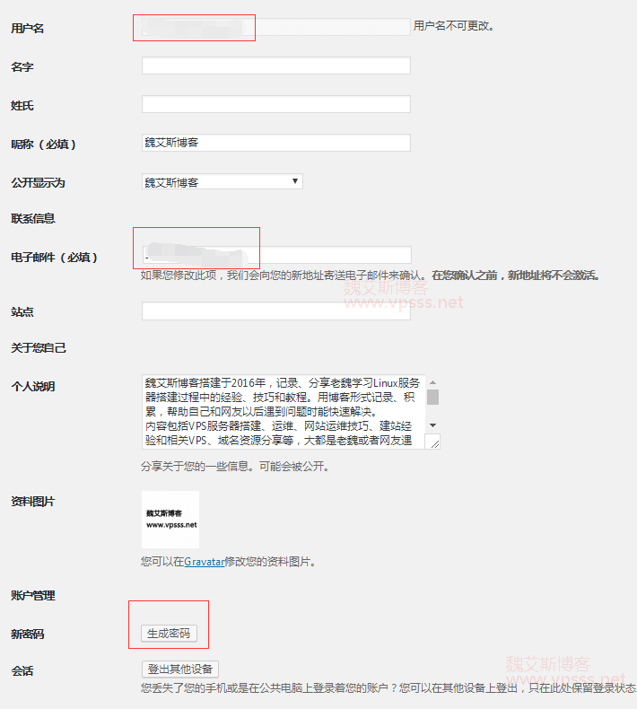 在 WordPress 管理后台的【用户】>【所有用户】中看到当前所有用户列表,找到管理员账号,鼠标放上去后点击【编辑】,看到如下界面。