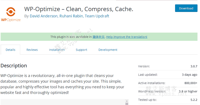 点击进入后看看右侧的版本、最后更新日期、支持 wordpress 版本及最高支持版本,这些数据是否符合你当前的情况。如果没问题就点击右上角“download”下载到本地电脑。