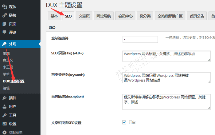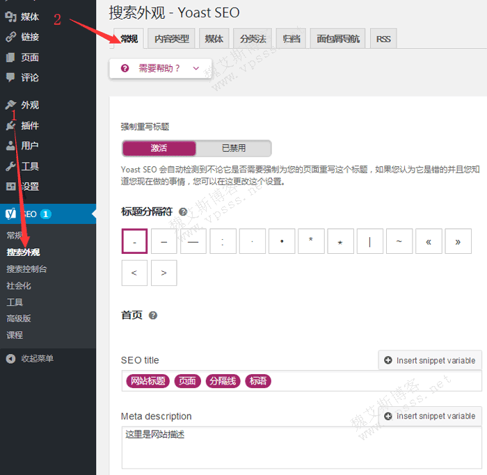 安装这个插件后,在设置下面会看到相关内容,SEO >> 搜索外观,右侧常规选项卡是网站首页的标题、描述写法。
