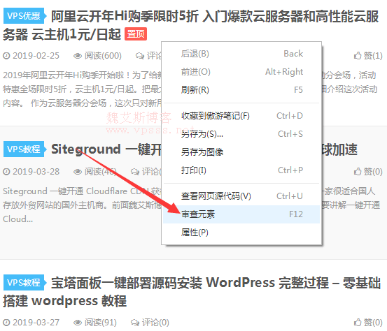 以魏艾斯博客首页为例,先打开你要批量抓取链接的网页,在网页空白处点右键 >> 审查元素。