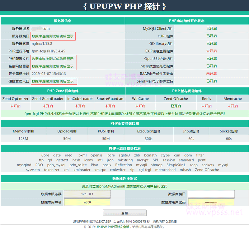 还有 php 参数情况,已编译模块,数据库连接测试。