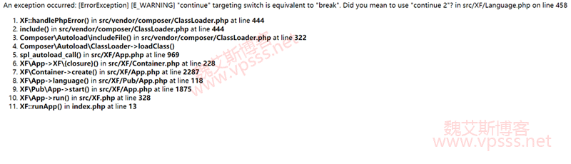 最近网友@guilty求助,运行xenforo论坛一段时间后,无意中把宝塔面板重装了一遍,然后打开论坛就提示:An exception occurred:[ErrorException][E_WARNING]continue targeting switch is equivalent to breakequivalent to break,Did you mean to use continue 2? 很长的一大段提示,如下图所示: