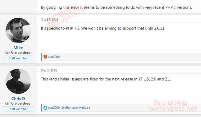 这么一大段错误提示,看了叫人蒙圈啊。不过老魏注意到第二行有 handlephperror 字样,估计是 php 解析方面出了问题。询问得知用的是 php7.3 版本。搜索后发现有网友遇到了相同问题,而官方技术人员回答说:It’s specific to PHP 7.3. We won’t be aiming to support that until 2.0.11.