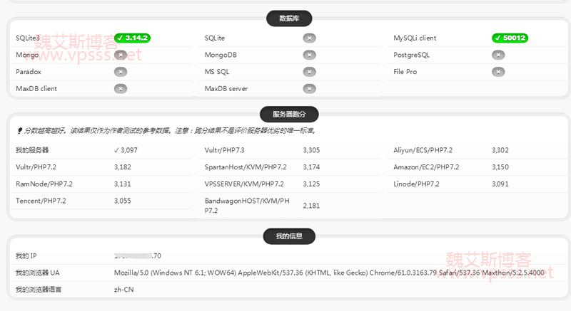 再下面是支持的数据库类型,还能自己评测当前服务器分数,与常见服务器的评分对比。最下面是访问者的信息。
