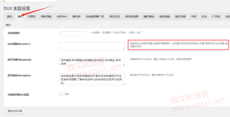 另外在模板中一般都有网站描述和网站关键词的添加项。比如DUX主题的SEO页面如下,里面都解释的很清楚了,照着做就行。不同主题都有不同的添加形式。