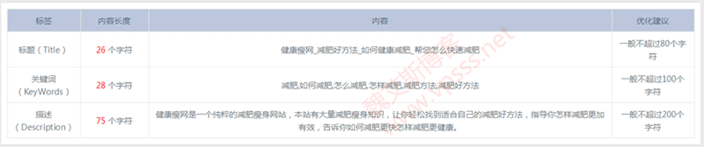 使用站长工具 http://seo.chinaz.com/,打开后把网址输入进去,点击查看结果,下拉页面看到对这三项的字数分析。这里给出的是优化建议,供你参考。
