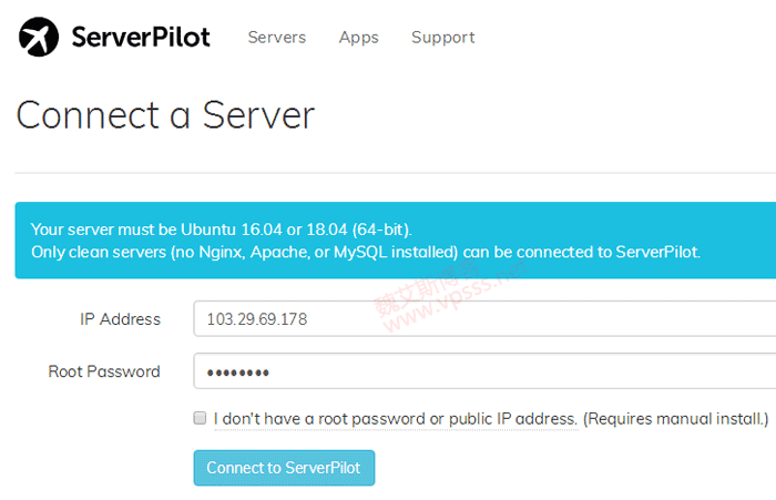 输入IP地址和root密码,点击connect to serverpilot就开始安装了。
