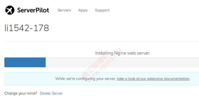 显示:Preparing to install ServerPilot 和 Starting installation,然后开始安装过程,以进度条显示。这个过程几分钟就可以了,我们什么都不用做,等着就可以了。