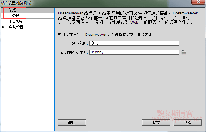 3、点击“新建”,看到下面的站点设置栏目,我们下面要用到的就是“站点”和“服务器”这两个栏目。先在右侧输入站点名称:测试,你自己的随便起吧。并且自定义一个本地站点文件夹,这里是存放全部网站文件的,以后我们修改本地文件也要在这里修改。