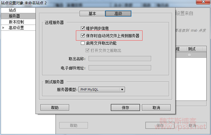5、勾选高级中的“保存时自动将文件上传到服务器”,这样你对本地文件的所有修改在保存后会自动上传到服务器上,实现本地网站和服务器文件的同步更新。