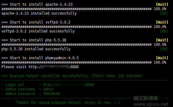 稍等几分钟看到下面提示就按照完毕了。最后看到程序给出了 Linux 面板登陆地址,账号和密码,并且用时 242 秒。