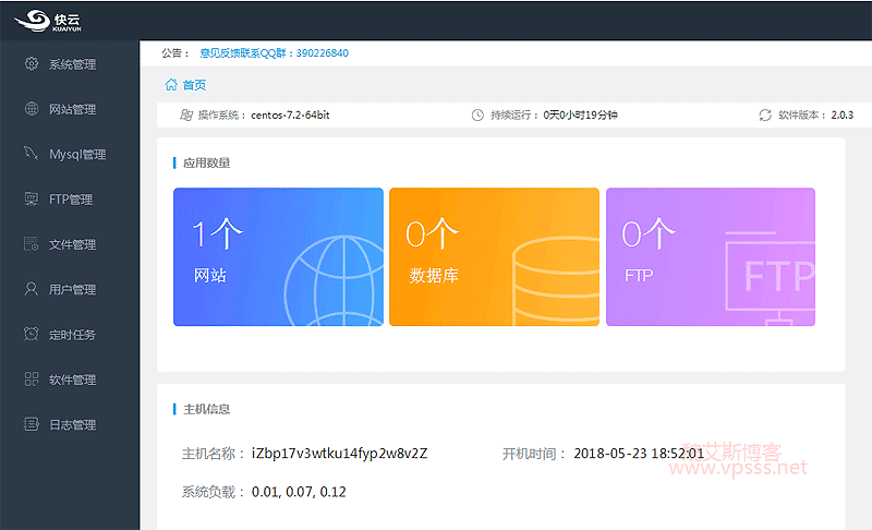 从快云小助手 Linux 面板后台来看,有提供网站管理、Mysql 管理、FTP 管理、文件管理、用户管理、定时任务、软件管理、日志管理等功能。
