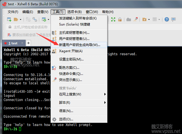 1、点击 Xshell 的工具-新建用户密钥生成向导,开始生成密钥。
