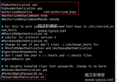 把 PasswordAuthentication yes 替换为 PasswordAuthentication no,禁止使用密码登录。