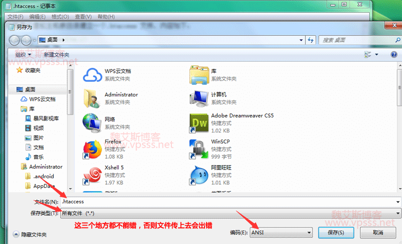 在本地电脑桌面建立一个 txt 文本文档,把要创建的内容放进去。然后选择【文件(F)】-【另存为(A)…】,弹出【另存为】对话框,在【文件名】一栏中输入【.htaccess】,【保存类型】选择【所有文件】,然后选择要保存的路径,单击【保存】。