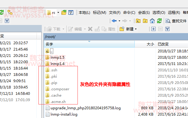 重新打开 root 文件夹,这时候就能看到下面的.acme.sh 文件夹了,大家从下图可以看到,灰色文件夹具有隐藏属性,用 xshell 是可以进去的,但是按照 Winscp 默认设置是不显示的,是看不到的文件夹。