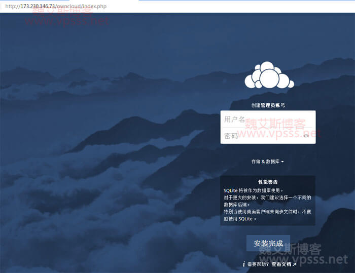 在浏览器地址行中输入你的服务器 IP/owncloud,就可以打开登陆界面了。